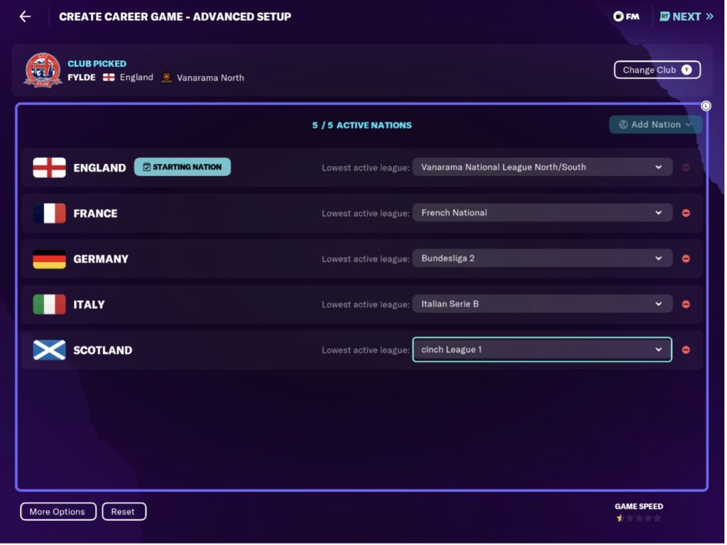 El límite establecido en Football Manager Mobile es de hasta cinco selecciones por partida guardada. Esto significa que puedes seleccionar hasta cinco naciones cuyas ligas (o al menos las principales divisiones) estarán presentes y serán jugables en tu partida.
