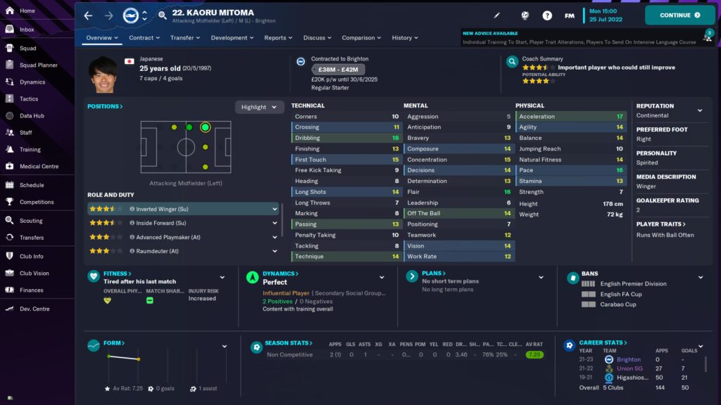 - Pie Preferido: Importante para roles tácticos específicos, como extremos que se quedan pegados a la banda (usan su pie fuerte en ese lado) o interiores que buscan recortar (usan su pie fuerte en el lado opuesto). También puedes buscar jugadores ambidiestros para mayor imprevisibilidad.