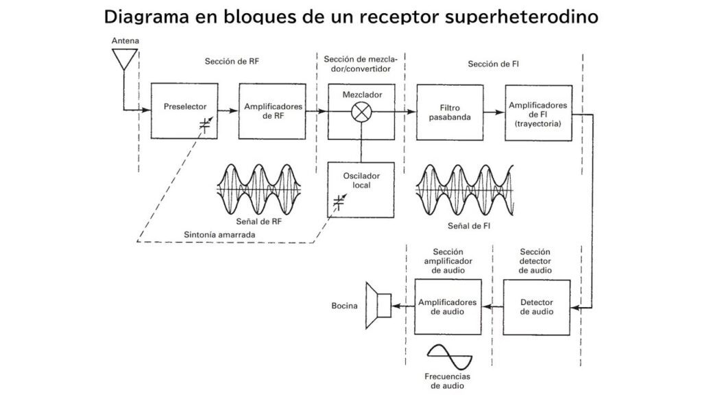 - Etapas de Audio/Procesamiento de Banda Base: Procesan la señal demodulada para su salida (por ejemplo, a un altavoz).