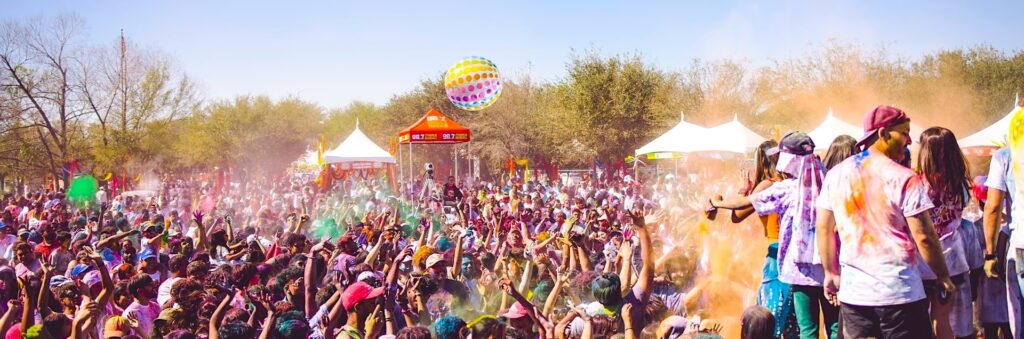 Estos colores, esparcidos en el aire y sobre las personas, crean un tapiz visual que encapsula la esencia del festival: vida, amor, devoción y la renovación de la naturaleza.