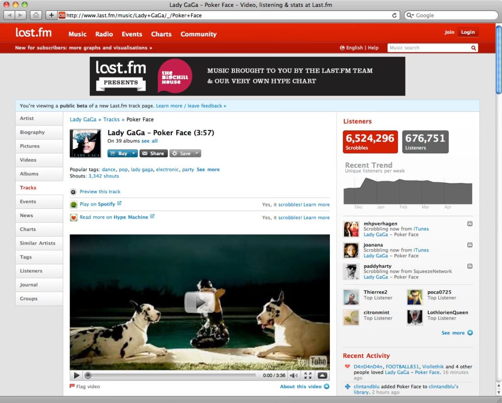 Las páginas de artista, álbum y canción también son ricas en información, gran parte de ella contribuida por la comunidad de usuarios a través de un sistema similar a un wiki. Aquí puedes encontrar biografías, listas de canciones, artistas similares, etiquetas populares y, a veces, videos musicales.