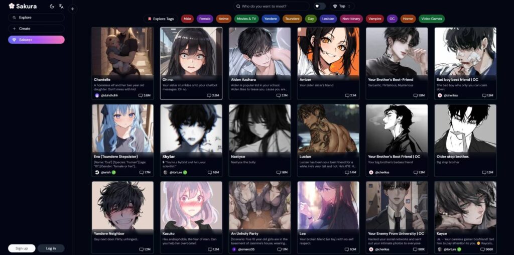 Sakura es una plataforma de chatbot IA que destaca por permitir chatear con personajes IA sin filtros y de forma completamente gratuita. Su diseño de sitio web es visualmente atractivo. Ofrece respuestas rápidas y fluidas. Permite seleccionar entre una amplia gama de personajes y buscar personajes sin filtrar. Las características incluyen: