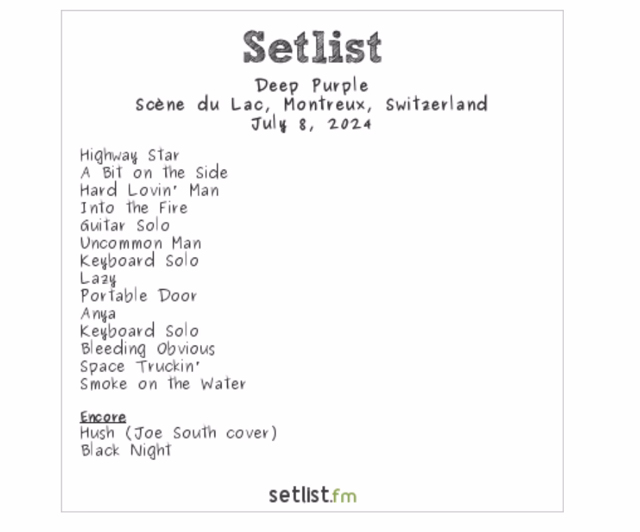El setlist incluye una mezcla de sus grandes éxitos clásicos como «Smoke on the Water», «Highway Star» y «Perfect Strangers», junto con temas de sus álbumes más recientes. También suelen incluir solos instrumentales extensos.